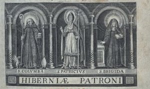 Thomas Messingham, Florilegium insulae sanctorum (Paris, 1626). This adaptation of earlier Latin Lives of Irish saints includes illustrations of the three most important – Ss Columbcille, Patrick and Brigid on its frontispiece. Here Patrick is dressed as a bearded Tridentine Bishop, and iconography that was to become the standard representation of the saint.